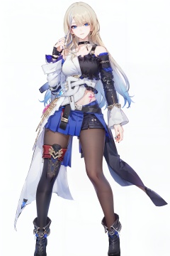 8k, best quality, masterpiece, (ultra-detailed:1.1), (high detailed skin), (full body:1.3), white background, standing, looking at viewer, (solo:1.4), <lora:xiluwa-v100:0.8:lbw=OUTALL>, xiluwa, 1girl, blonde hair, blue hair, black footwear, multicolored hair, long hair, skirt, earrings, pantyhose, blue eyes, jewelry, asymmetrical sleeves, bare shoulders, black choker, bangs, Lightning tattoo, thigh_strap, (white background, simple background:1.6), good_hands, (beautiful_face), ((intricate_detail)), clear face, ((finely_detailed)), fine_fabric_emphasis, ((glossy)), full_shot