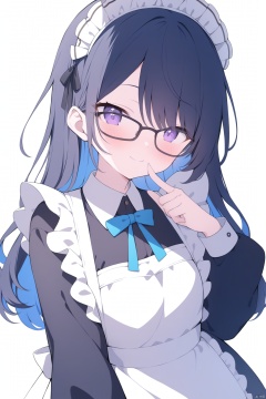 masterpiece, best quality, cute, kawaii, 1girl, solo, black hair, glasses, maid, colored inner hair, long hair, maid headdress, multicolored hair, smile, looking at viewer, apron, blush, upper body, simple background, blue hair, black-framed eyewear, bangs, purple eyes, maid apron, dress, finger to mouth, two-tone hair, closed mouth, long sleeves, index finger raised, black dress, white apron, collared dress, grey background, puffy sleeves, frills, white background, hand up