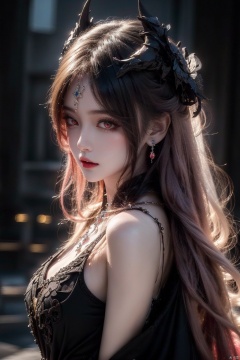 beautiful cute crystal girl in 16 years old, wearing crystal wear, the crystal is evil, black and pink and red glowing crystal, crystal pink hair, she is smiling and she is powerful, she have devil horns,the power is every wear, she is evil but cute, the crystal is evil and glowing black and pink and red colors, detailed evil eyes, she has a cute canine, glowing crystal wear, (incredible details, cinematic ultra wide angle, depth of failed, hyper detailed, insane details, hyper realistic, high resolution, cinematic lighting, soft lighting, incredible quality, dynamic shot,,Hair with scenery,The eye,yuyao, 1girl