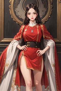 Top level CG, highest image quality, masterpiece, exquisite and delicate beautiful girl, (185cm beautiful woman), (tall figure), imperial sister, queen temperament, fair skin, ((long legs)), perfect facial features, bright eyes, seductive posture, red lips, beautiful and cold, red clothes, (big breaks), beautiful and heroic, soft and long hair, sparkling, lace edge, mesh, perspective visible skin, diamond earrings, ruby necklace, (black and white uniform), 8k image quality, (realistic portrait), characters occupying the entire painting surface. (Facial lighting), (Standing)