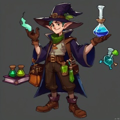 (European and American Style) (Character Stands), Gloves, Single, Hat, Potions, Pointed Ears, Gray Background, 1boy, Simple Background, Hand Held, Male Focus, Brown Shoes, Smile, Belt, Full Body, Book, Witch Hat, Pants, Vial, Standing, Earrings, Test Tube, Boots, Flask, Jewelry, Green Gloves, Blue Gloves