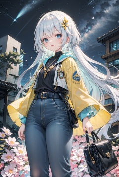 Exquisite and clear background, little girl, elementary school student figure, single person, waist length black long hair slightly curled, bangs naturally parted on both sides, dark gray gradient glass colored eyes, hair blown by the wind, casual wear, black and blue undershirt, gray denim jacket, white casual pants, holding travel bag, expression of longing, night, dreamy starry sky, Milky Way, distant sea lights, fireflies, petals, dazzling stars