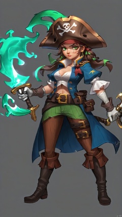 (european and american style) (character drawing), 1girl, green eyes, solo, weapon, hat, grey background, pirate hat, pirate, brown footwear, brown hair, sword, torn clothes, pants, single glove, full body, simple background, boots, belt, ascot, standing, hand on hip, looking at viewer, brown gloves, brown belt, tentacles, black pants, holding weapon, gloves, holding, short sleeves