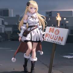 1girl, IncrsNFAMeme, sign, <lora:NoFunAllowedMemeV2:1>, Tsunomaki Watame, long hair, WatameBase, fur-trimmed dress, white dress, bare shoulders, fur-trimmed sleeves, hairclip, cape, belt pouch, brooch, fur-trimmed boots, <lora:Char_VTuber_TsunomakiWatame:0.8>, smile,