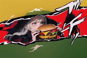 High Quality, Masterpiece, incrsperscutin, <lora:PersonaCutInV2:1>, two-handed burger, eating, burger, holding huge burger with both hands, close-up, <lora:Pos_EatingHugeHamburger:0.6>, simple background,