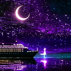 <lora:star_xl_v3:1>,a person standing on a beach next to a large ship at night with a full moon in the sky,1girl,solo,short hair,dress,standing,outdoors,sky,cloud,water,night,halo,moon,star \(sky\),night sky,scenery,starry sky,crescent moon,building,reflection,city,fantasy,city lights,The image portrays a serene nighttime scene by a body of water. The sky is painted with hues of purple,blue,and a crescent moon. The water reflects the colors of the sky and the lights from the ship. On the left,a silhouette of a girl stands by the water's edge,gazing at the ship. She wears a dress and has a glowing headpiece. The ship,illuminated with lights,appears to be a large vessel with multiple decks. The entire scene is bathed in a magical ambiance,with sparkles and particles floating in the air,adding to the dreamy atmosphere.,body of water,ship,girl,headpiece,decks,magical ambiance,sparkles,particles,