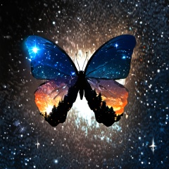 outdoors,wings,sky,no humans,butterfly,nature,scenery,forest,sunset,silhouette,butterfly wings,star \(sky\),starry sky,a brightly colored fluorescent butterfly with wings showing a cosmic scene and a black body,the upper part of the wings is blue like the starry sky and the lower part is orange like the sunset.,the background is dark which possibly representing a tree or a rocky surface and is adorned with sparkling stars and a bright shooting star,image,translucent material,cosmic scene,galaxy or nebula,dark background,sparkling stars,bright shooting star,<lora:star_xl_v3:1>,