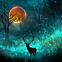 <lora:star_xl_v3:1>,silhouette painting, ethereal ambiance, outdoors, sky, orange and cyan theme, tree, no humans, night, glowing, moon, grass, star \(sky\), nature, night sky, scenery, starry sky, silhouette, dark, antlers, crescent moon, deer, solo, forest, a mystical and enchanting nighttime forest scene, a large glowing crescent moon casting a soft light over the landscape, the forest is dense with trees and their branches intertwining and forming a canopy., the ground is covered with grass and small plants, and there are a few birds flying in the distance, a black silhouette of majestic stag with large antlers stands illuminated by a golden light, the entire scene is bathed in a blend of cool and warm tones, a sense of wonder and magic, mystical, enchanting, nighttime, plants, birds, stag, golden light