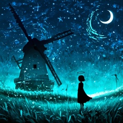 <lora:star_xl_v3:1>,silhouette painting, ethereal ambiance, 1girl, solo, short hair, cyan theme, flower, outdoors, sky, night, halo, moon, grass, star \(sky\), night sky, scenery, starry sky, dark, from behind, tree, glowing, angel, crescent moon, a mesmerizing nighttime landscape, a vast and starry sky filled with countless stars and a radiant celestial body possibly a moon or planet casting a glow., the ground is covered in a luminescent glowing grass that seems to be swaying in the wind., a black silhouette of an old windmill at the right, a black silhouette of a girl standing amidst the grass gazing up at the celestial display, ethereal and dreamlike, evoking feelings of wonder and contemplation, mesmerizing nighttime landscape, vast starry sky, radiant celestial body, luminescent grass, old windmill, sails, child, ethereal dreamlike ambiance