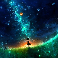 <lora:star_xl_v3:1>,silhouette painting, ethereal ambiance, 1girl, solo, short hair, blue and orange theme, dress, outdoors, sky, cloud, water, night, glowing, halo, moon, star \(sky\), night sky, scenery, starry sky, city, fantasy, horizon, cityscape, surreal, black hair, standing, building, fish, a thick beam of light shot from the grass into the sky, a radiant blue moon in the sky surrounded by a myriad of stars and nebulae and other cosmic elements, there's a vast expanse of space filled with stars and a few celestial bodies, a mix of rocky terrain and magma, a silhouette of a child with a glowing green aura and glowing legs standing on the ground and  surrounded by bubbles which floating in the air, soft ethereal light