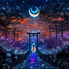 <lora:star_xl_v3:1>,silhouette painting, ethereal ambiance, 1girl, cyan and orange theme, solo, short hair, black hair, dress, outdoors, sky, from behind, tree, night, moon, star \(sky\), scenery, starry sky, bubble, stairs, silhouette, torii, crescent moon, standing, star \(symbol\), a black and blue silhouette of a girl, halo, railing, a surreal and ethereal landscape., a black and blue silhouette of a girl with long hair who is wearing a blue dress, standing on a bridge that seems to lead to a glowing otherworldly city, the city is illuminated by a radiant light of sunrise with structures that resemble traditional japanese torii gates above the city, a crescent moon surrounded by stars and celestial bodies, the sky is painted with hues of blue and purple and orange, a sunrise, a dreamy atmosphere with floating orbs and bubbles adding to the magical ambiance