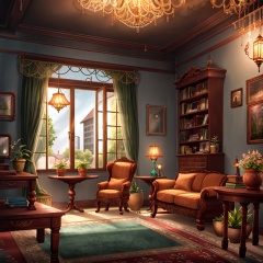 couch, no humans, indoors, television, scenery, lamp, book, table, window, carpet, plant, chair, chandelier, flower, vase, door, rug, ceiling light, painting (object), picture frame, shelf, potted plant, stairs, bed, cabinet <lora:Artist-Sakimichan:0.7>