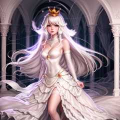 1 white-haired girl with silver crown, wearing white wedding dress and white stockings, standing indoors, dynamic ang <lora:Artist-Sakimichan:0.7>