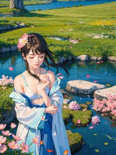 (8k, best quality, masterpiece:1.2), (realistic, photo-realistic:1.5),1girl, cute, sitting, dating, (smile:1.15), (closed mouth) medium breasts, beautiful detailed eyes,  <lora:hanfu_v20:0.5>,(Hanfu, tang, Tang Dynasty, Tang clothing: 1.4),full body,  <lora:3loraGuofeng3Lora_v32LoraBigLight:0.5>,  <lora:goutouLora_v20:0.5>, ((topless)), ((bra)), beautiful and delicate water, the finest grass, very delicate light, nature, painting, water spray, breeze, flowers and grass meadow, near the water edge, (sunset, starry sky in a circle), randomly distributed clouds, river, splashing water, falling petals