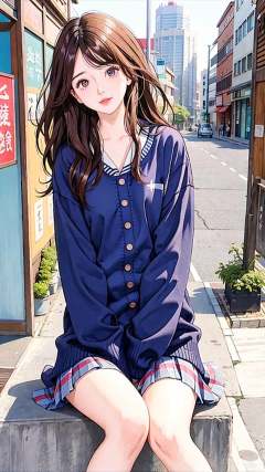(ins style: 1.5), (masterpiece), 8k wallpaper, illustration, 1 girl, (single player: 1.5), (red perm), (hair decoration), sitting on the side of the road, in the old town, (real street view: 1.4), [warm light], (dilapidated and complex street scene), (frigid face: 1), [Japanese student uniform | top], [Japanese student skirt], (bell mouth), (rich colors), [jeans ], (sneakers), [clear Japanese background], [japanese street shop], [(gaze)|(horizontal angle of view)], (dynamic angle), (light), (daytime: 1.3), [(background clearly visible )|(complicated Japanese street scene)], (quiet atmosphere), (peaceful), [(quiet)|(considerate)], (exquisite face), (detailed face), (special, the most good aesthetic, new, latest, best quality, masterpiece, very detailed, anime:1.2), ulzzang-6500-v1.1, <lora:girlhandfix:0.3>, <lora:画风唯美Samia:0.5>, <lora:chilloutmixss_xss10:0.3>