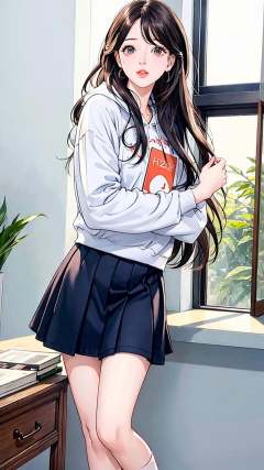 dreamlikeart,(ins style: 1.5), (masterpiece), 8k wallpaper, illustration,( 1 girl, 25 years old,(solo: 1.5), (hair), (hair accessories), standing, desk, (real street view: 1.4), [warm Light], (the bookshelf is full of books), (tsundere face: 1), [hoodie top], [hoodie skirt], (pleated), (flare mouth), (rich colors) ,[white stockings], (sneakers), [the setting sun is outside the window], [holding a book in hand], [(gazing)|(horizontal viewing angle)], (dynamic angle), (light), (daytime :1.3), [(window behind) )|(interior detailed furniture)], (quiet atmosphere), (peaceful), [(tranquil)|(real window view)], (special, best aesthetic, New, Latest, Best Quality, Masterpiece, Very Detailed:1.2 ), ulzzang-6500-v1.1, <lora:girlhandfix:0.3>, <lora:画风唯美Samia:0.5>, <lora:chilloutmixss_xss10:0.3>