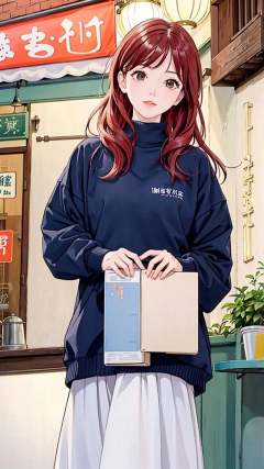 (ins style: 1.5), (masterpiece), 8k wallpaper, illustration, 1 female, (solo: 1.5), (red hair), (hair accessories), standing, in the old town, (coffee shop: 1.4), [warm Light】,(shabby and complicated street scene),(frigid face: 1),【Japanese student clothes|tops】,【Japanese student skirt】,(pleated),(bell mouth),(rich colors),【white Stockings], (sneakers), [clear Japanese background], [Japanese street shop], [(gaze)|(horizontal view)], (dynamic angle), (light), (daytime: 1.3), [(background clear Visible)|(complicated Japanese street scene)], (quiet atmosphere), (peaceful), [(serene)|(thoughtful)], (bookworm), (nerd),(exceptional,best aesthetic,new,newest,best quality,masterpiece,extremely detailed,anime:1.2),ulzzang-6500-v1.1,<lora:girlhandfix:0.3>, <lora:画风唯美Samia:0.5>, <lora:chilloutmixss_xss10:0.3>