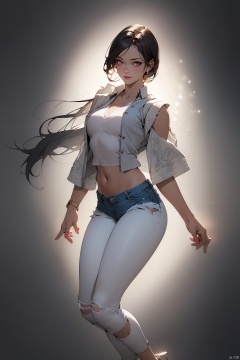 ((1 girls)), beauties body, beautiful faces,detailed facial features, smiles, exquisite clothing, clothing, exquisite hair accessories, (((A white vest, revealing the abdomen, ultra short jeans,)))