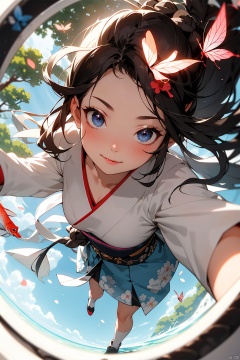 (Highest picture quality), (Master's work), (Detailed eye description),(macro shot:1.25),(8K wallpaper), (Detailed face description),depth of field,(lens flare), falling petals,(standing:0.85), (close-up:0.8),(fisheye:1.2), (1loli:1.2),(from above:1.2),1girl, solo, long hair, outdoors, brown hair, looking at viewer, long sleeves, blue eyes, braid, bangs, grass, dress, blush, standing, smile, flower, full body,tree, day,hair ornament,cloud, parted lips, floating hair, tassel,hair ribbon, bug, floral print, sky, medium breasts, braided ponytail, butterfly, water, animal, closed mouth, socks, single braid, white socks, cloudy sky, east asian architecture, red flower, sidelocks, branch, mountainous horizon,white flower, rope, obi,Dynamic angle,Bottle bottom,colorful,floating wind,