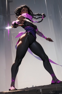 illustration, paint on old parchment paper, man ninja, (((stunningly handsome african man))), long black and white dreadlocks. 25 years old. Eyes, purple_eyes, serious and caring face, cute. Perfect lips, in the rain, wet skin. sword, xxmix_man, detailed eyes, handsome face, wide nose, slim eyes, very muscular body, toned body, nice legs, toned legs, full body, cinematic lighting from behind, purple neon dust, purple neon glow, black ninja clothes with blue accent. futuristic hi-tech outfit, long purple neck scarf, dynamic pose, action, from below,ink scenery, black and purple colors only, pen and brush stroke, action_lines, motion_lines