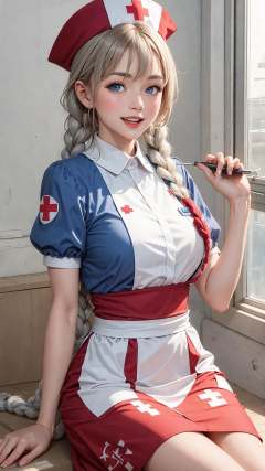 masterpiece, best quality, 1girl, arm support, bangs, belt, blue dress, blue eyes, blue headwear, blush, braid, braided ponytail, breasts, closed mouth, collared dress, constellation print, cowboy shot, cross, cross print, dress, dutch angle, eyelashes, grey hair, hair between eyes ,hand up, hat, large breasts, light smile, lips, long braid, long hair, looing at viewer, medium breasts, multicolored clothes, multicolored dress, nurse cap, open mouth, parted lips, pin bacground, puffy short sleeves, puffy sleeves,red cross, red dress, sash, short sleeves, sidelocs,simple bacground, single braid, sitting, setch, smile, solothighs, two-tone dress, very long hair, white hair, white sash,