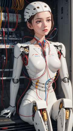 (((masterpiece))), (((best quality))), ((ultra-detailed)), (highly detailed CG illustration), ((an extremely delicate and beautiful)),(cute delicate face),cinematic light,((1mechanical girl)),solo,full body,(machine made joints:1.4),((machanical limbs)),(explosed muscles),(blood vessels connected to tubes),(a brain in container:1.3),((mechanical vertebra attaching to back)),((mechanical cervial attaching to neck)),((sitting)),expressionless,(wires and cables attaching to head and body:1.5),small breasts,short hair,(character focus),science fiction