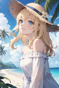 (movie poster:1.2), soft lighting, (dramatic angle:1.25),(solo:1.4), (1girl),((blonde hair), long curly hair), blue eyes, (smile),beach straw hat, (off-shoulder shirt), hat flower ,(looking to the side:1.3), fantastic colorful, sea ,coconut tree, blue sky with clouds,(beach:1.3) ,(masterpiece:1.2),ultra-detailed,(best quality), illustration, (Depth of field),