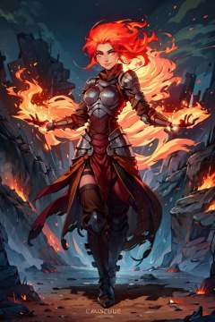 ((masterpiece,best quality)), absurdres, <lora:Fiery_Hair:0.8>, Fiery_Hair, fiery hair, glowing,  1girl,  solo, smiling, looking at viewer, cowboy shot,  shiny metal, full body armor, breastplate, fingerless gloves, shoulder armor, gauntlets