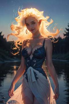 (masterpiece, best quality:1.2), beautiful eyes, <lora:Fiery_Hair:1>, Fiery_Hair, fiery hair, glowing, long hair, large breasts, cleavage, bare shoulders, very long hair, blue fire, blue fire hair, upper body, outdoors, sky, pointy ears, night, floating hair, colored skin, colored sclera, flat color, yellow sclera, looking at viewer, vampire, fangs, smile, white sundress, sun hat, flowing winds, sunny, outdoors,