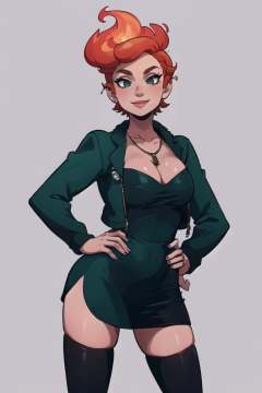 ((masterpiece,best quality)), absurdres, <lora:Fiery_Hair:0.8>, Fiery_Hair, 1girl, hand on hip, contrapposto, smile, short hair, thighhighs, dress, cleavage, jewelry, green eyes, jacket, red hair, black thighhighs, necklace, orange hair, black dress, zettai ryouiki, short dress,