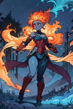 ((masterpiece,best quality)), absurdres, <lora:Fiery_Hair:0.8>, Fiery_Hair, fiery hair, glowing,  long hair, large breasts, cleavage, bare shoulders, very long hair, blue fire, blue fire hair, upper body, outdoors, sky, pointy ears, night, floating hair, colored skin, colored sclera, flat color, yellow sclera shiny metal, full body armor, breastplate, fingerless gloves, shoulder armor, gauntlets