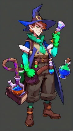 (European and American Style) (Character Stands), Gloves, Single, Hat, Potions, Pointed Ears, Gray Background, 1boy, Simple Background, Hand Held, Male Focus, Brown Shoes, Smile, Belt, Full Body, Book, Witch Hat, Pants, Vial, Standing, Earrings, Test Tube, Boots, Flask, Jewelry, Green Gloves, Blue Gloves