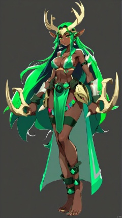 (european and american style) (character drawing), 1girl, long hair, solo, grey background, barefoot, breasts, dark skin, simple background, dark-skinned female, green hair, full body, medium breasts, very long hair, gauntlets, standing, jewelry, helmet, horns, antlers, armor, bikini, swimsuit