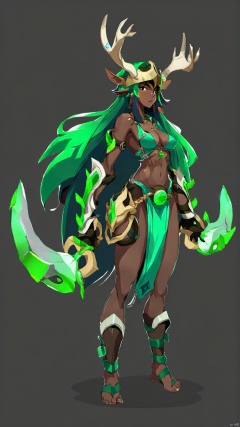 (european and american style) (character drawing), 1girl, long hair, solo, grey background, barefoot, breasts, dark skin, simple background, dark-skinned female, green hair, full body, medium breasts, very long hair, gauntlets, standing, jewelry, helmet, horns, antlers, armor, bikini, swimsuit