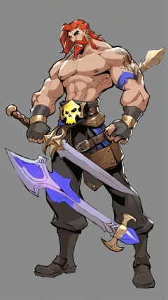 (european and american style) (character drawing), grey background, 1boy, holding, weapon, over shoulder, male focus, solo, weapon over shoulder, holding weapon, facial hair, muscular, pants, sword, simple background, holding sword, gloves, beard, pouch, belt, topless male, abs, muscular male, full body, colored skin, pectorals, teeth, fingerless gloves, boots, standing, collarbone, earrings, glowing, tattoo, red hair, navel, black pants, smile