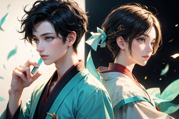 (tmasterpiece),(Best quality at best),Cinematic quality,Rendered by Octane,Ultra-detailed details,Wind magic,(1boy:1.5),Face of a young man,Facial detail portrayal,Perfect facial features,(The air is filled with cyan wind blades:1.5),watch audience,(Ancient Chinese Hanfu:1.2),(holding a longsword:1.2),picture puzzle,two people,back to back,