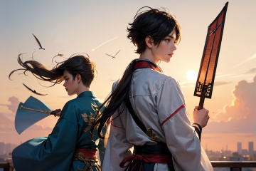 (masterpiece),(Best quality at best),Cinematic quality,Rendered by Octane,Ultra-detailed details,Wind magic,(1boy:1.5),Face of a young man,Facial detail portrayal,Perfect facial features,(The air is filled with wind blades:1.5),watch audience,(Ancient Chinese Hanfu:1.2),(holding a longsword:1.2),picture puzzle,(two people),(back to back),