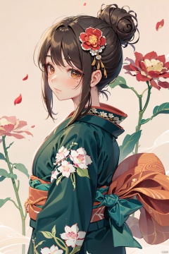 Ukiyo-e style, 1girl, solo, hair ornament, japanese clothes, flower, kimono, looking at viewer, hair flower, upper body, brown eyes, mole, blush, mole under eye, bangs, red flower, closed mouth, sidelocks, floral print, brown hair, white background, from side, simple background, sash, obi, print kimono, looking to the side, petals, long hair, hair bun, Ukiyo-e style, chinese style,<lora:EMS-265964-EMS:0.600000>