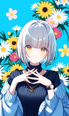 1girl, watch, solo, wristwatch, floral background, sweater, looking at viewer, jewelry, upper body, bangs, flower, blush, off shoulder, necklace, long sleeves, closed mouth, hands up, grey hair, yellow eyes, black sweater, own hands together, open clothes, shirt, short hair, jacket, cardigan, blue background, turtleneck, blue sweater