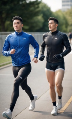 👫, a Handsome man and a pretty woman running together,(RAW Photo,Masterpiece,High Resolution,photorealistic,Realism,best quality,sharp focus, profession),Asian, exquisite facial features,handsome,muscular,flat top hair,textured skin,tights,kneehigh socks,Nike windbreaker Sneakers,gloves,running,blurry,outdoors,sunshine, Ray Tracing,full body,Dynamic angle,1man,