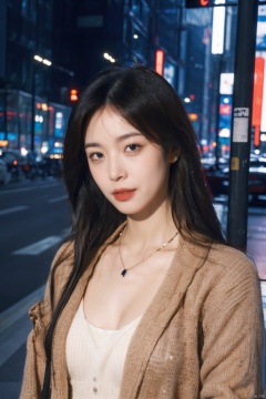 A futuristic cyberpunk character with sleek black hair leaning against a polished,brown eyes,reflective surface. The clothing,a mix of high-tech materials and avant-garde design,complements the anamorphic film treatment. A small LED necklace illuminates her neckline in the dimly lit urban environment,capturing the essence of a 2007 blog-photo.,breasts,cleavage,, ,(8K, best quality:1.2),(photo, photorealistic:1.37),(ultrahigh-res),High detail RAW color photo professional close photograph,(highly detail face: 1.2),pore,(real human skin),film grain,by Laurence Demaison,