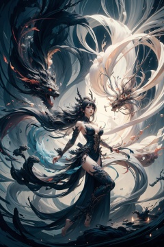 style of Karol Bak,the 1girl with white hanfu is standing in front of the black (chinese_dragon),bare legs,barefoot,dynamic pose,looking away,in the style of otherworldly beings,animecore,dark and menacing,intricate illustrations,delicate linework,fine details,whimsical patterns,enchanting scenes,dreamy visuals,captivating storytelling,gorecore,enigmatic characters,twisted characters,depth of field,floating,dynamic angle,long exposure,(motion blur):1.2,fluid movement,ethereal atmosphere,dreamy trails,dynamic energy,time-lapse effect,