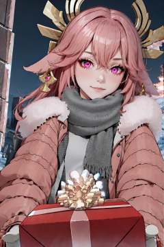 1girl, IncrsGettingAPresent, <lora:POVGettingAPresent:1>, pov, winter clothes, scarf, yae miko, pink eyes, long hair, pink hair, animal ears, <lora:Char_GenshinImpact_YaeMiko:1>