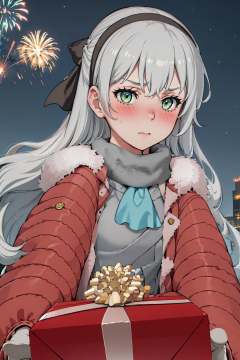 1girl, IncrsGettingAPresent, pov, winter clothes, scarf, <lora:POVGettingAPresent:1>, elie macdowell, green eyes, hairband, blue ascot, hair ribbon, <lora:Char_OC_ElieMacDowell:0.9>, outdoors, fire works, night, shy, blush,