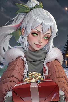 1girl, IncrsGettingAPresent, pov, winter clothes, scarf, <lora:POVGettingAPresent:0.9>, outdoors, night, blush, seductive smile, smirk, xbox-chan, ponytail, green hair ribbon, <lora:Char_Meme_Xboxchan:0.9>