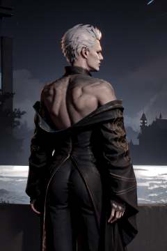 kimono, from behind, off shoulder, shoulder blades, <lora:OffShoulderKimono:1>, outdoors, night, vergil(dmc5), <lora:Char_DMC_Vergil:0.75>