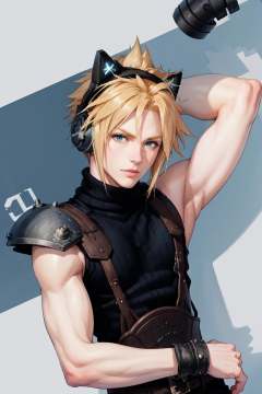 1boy, incrsheadphones, <lora:HeadphonesWithCatearsV2:1>, cloud strife, shoulder armor, sleeveless turtleneck, suspenders, belt, <lora:Char_FF7Remake_CloudStrife:0.9>, upper body,