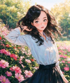 best quality, hyper realism, (ultra high resolution), masterpiece, 8K, RAW Photo,1girl,outdoor,(beautiful face:1.5),see throug,90s, Long hair reaching the waist,In the morning, in the flowers,hide hands behind back, slender waist,Modern and fashionable hairstyle,shirt tucked in,overskirt