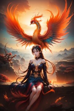 1 girl behind the phoenix, Woman focus, fire, dress, bird, breasts, Long hair, Hanfu, sitting, cowboy shot, Fisheye lens,Colorful_phoenix, Colorful2, bird, outdoors, flower, branch, beak<lora:kim_phoenix6:1>