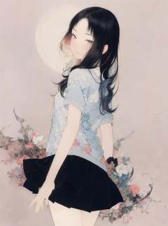 best quality,masterpiece,ultra high res,1girl,minimalism,looking at viewer,umino,circle,Takato Yamamoto style,multicolored_skirt,<lora:海野浩漠Umino_Hiromaku:0.8>,simple background,white_background,gradient background,moon,